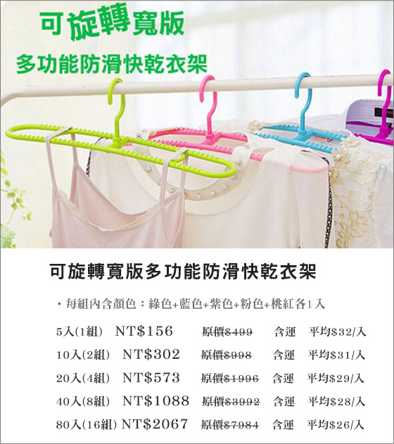 聚餐時刻又到了, 17Life-吃喝玩樂團購3折起,又讓愛聚餐的我們買不停吃不停,價格超殺,如果點進去已經售完別捶心肝喔!限時限量的團購券先搶先贏喔! 可旋轉寬版多功能防滑快乾衣架
